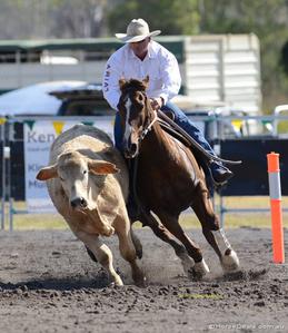 Campdrafting involves a mounted rider riding into a “camp” (round pen) which has six to eight head of cattle in it. The rider cuts out one steer or heifer from the cattle in the camp and brings the animal to the front of the pen, then blocks and turns the steer at least two or three times to prove to the judge that they have the steer under control. The rider then calls for the gates to be opened into the arena.